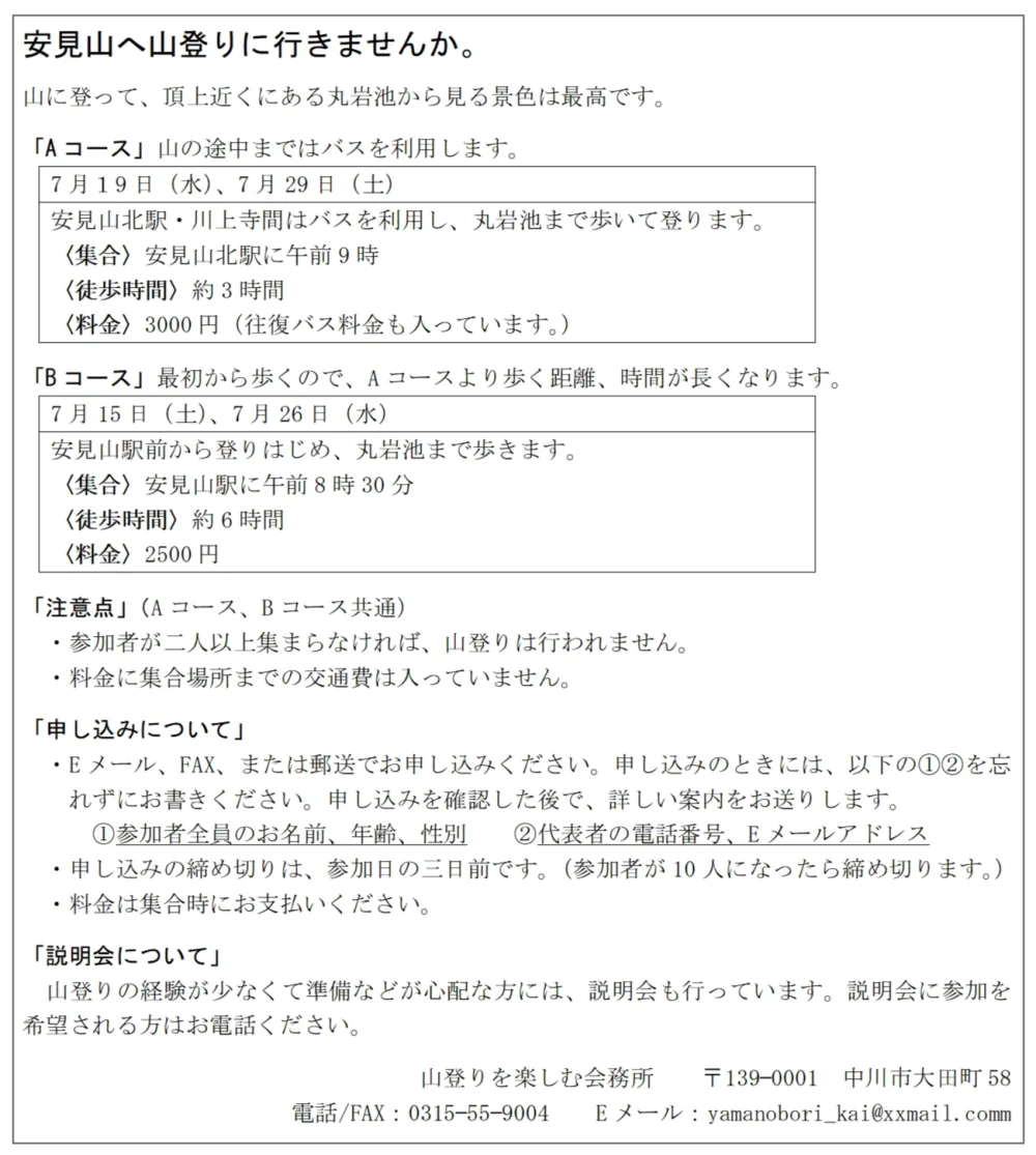 精品真题-N3阅读问题07随机试卷wapai6个月前发布关注私信11032 0% 0 投票, 0 平均值 0 N3 精品真题-N3阅读问题07随机试卷 从历年真题中随机抽取当前题目类型中的若干道问题进行显示,方便您对一类问题进行多次训练,快速提高 阅读问题07 右のページは、動物園のポスターである。これを読んで、下の質問に答えなさい。答えは、1•2 •3•4 から最もよいものを一つえらびなさい。 1 / 10 分类: N3阅读问题07 問題7 つぎのベージは、あるスキー場のホームページに載っているスキー教室の案内である。これを読んで、下の質問に答えなさい。答えは、1・2・3・4から最もよいものを一つ選びなさい。 阅读问题07-38 ウンジさんは友達と一緒に山登りに参加したいと思っている。バスを使わずに最初から歩いて登れるもので、土曜日のコースがいい。ウンジさんたちの希望に合うのはどれか。 1) Aコース、7月19日 2) Aコース、7月29日 3) Bコース、7月15日 4) Bコース、7月26日 收藏 73.正解:3 解析:问题是:ンジさん想要和朋友一起去爬山,希望是不坐巴士从头开始爬,周六的路线最好,符合ウンジさん的要求的是哪一个? 符合时间(周六)的两个选项是选项2 A コース7月29日和选项3 Bコース7月15日。符合不坐巴士只爬山的条件的就只有选项3 了。 阅读问题07 右のページは、市民マラソン大会の案内である。これを読んで、下の質問に答えなさい。答えは、1 • 2 • 3 • 4 から最もよいものを一つえらびなさい。 2 / 10 分类: N3阅读问题07 問題7 つぎのベージは、あるスキー場のホームページに載っているスキー教室の案内である。これを読んで、下の質問に答えなさい。答えは、1・2・3・4から最もよいものを一つ選びなさい。 阅读问题07-39 島原さんは「10キロ」に参加しようと思っている。島原さんはクレジットカードを持っていないので、参加費をクレジットカードで払うことができない。島原さんに可能な申し込み方法はどれか。 1) 1月23日から2月7日の間に郵便局で申し込む。 2) 1月23日から2月7日の間に電話で申し込む。 3) 1月23日から2月21日の間にインターネットで申し込む。 4) マラソン大会当日に会場で申し込む。 收藏 39.正解:1 解析:从表中可以看出,所有的参加项目都可以于1月23日到2月21日之间在网上进行申请,要付参加费的项目要用信用卡支付费用。而岛原没有信用卡,只能于1月23日至2月7日到邮局进行转账并申请。综上所述,应该选1。 阅读问题07 下の表は電車の時刻表(※)です。これを見て、次の質問に答えなさい。答えは、1・2・3・4から一つ選びなさい。 3 / 10 分类: N3阅读问题07 問題7 つぎのベージは、あるスキー場のホームページに載っているスキー教室の案内である。これを読んで、下の質問に答えなさい。答えは、1・2・3・4から最もよいものを一つ選びなさい。 阅读问题07-37 (※)この時刻表には、電車の出発時間や到着時間が書いてあります。到着と言うのは、着くと言う意味です。 7月15日に東京から新大阪へ行きます。東京駅に8:04に着きました。なるべく早く新大阪駅に着くためにはどの電車に乗らなければなりませんか。 1) 8:03のぞみ103です 2) 8:06ひかり403です 3) 8:13のぞみ009です 4) 8:20のぞみ211です 收藏 73.正解:3 解析:从表中可以看出,8:04之后从东京发车到新大阪的车次中,到达新大阪时间最早的是8:13发车的のぞみ009,于10:49到达,其他可搭乘车辆都晚于10:49。所以正确答案为选项3。 翻译 (※)这个时刻表上写着电车的出发时间和到达时间。到达是到达的意思。 阅读问题07 つぎの文章は、「山中さくらまつり」に協力してくれる人を募集するための案内である。つぎの質問に答えなさい。答えは、1·2·3·4から最もよいものを選びなさい。 4 / 10 分类: N3阅读问题07 問題7 つぎのベージは、あるスキー場のホームページに載っているスキー教室の案内である。これを読んで、下の質問に答えなさい。答えは、1・2・3・4から最もよいものを一つ選びなさい。 阅读问题07-38 さくらまつりの協力者になるためには、どうすればよいか。 1) 3月27日までになるべく早く市役所に郵便かファックスで申し込む。 2) 3月27日までの平日の午前9時から午後5時の間に電話で申し込む。 3) でるだけ早く山中市役所の市民課広田さんにEメールで申し込む。 4) 市役所ホームぺージの応募用紙を使ってインターネットで申し込む。 收藏 问题是:要成为樱花祭典的合作者,应该怎么做?从问题的选项中可以得知,考察的是报名的方法。在表中的「申し込み方法」中,可以得知,需要填写应征表,然后以 fax 或者邮寄的形式送达。应征表可以在市役所官网下载。截止时间是3/27下午5点,但是因为招募人数优先,先到先得。 选项1,截止3/27,尽早给市役所发 fax 或者邮寄的形式报名,只有这一项是完全符合的。 选项2,截止3/27,工作日上午9点到下午5点,电话报名。并没有电话报名这一方法。表格中的电话是用来咨询的。 选项3,尽早给山中市役所发邮件。没有发邮件报名的方式。 选项4,使用市役所官网的报名表在网上报名。没有网上报名这一项。 翻译 阅读问题07 右のページは、動物園のポスターである。これを読んで、下の質