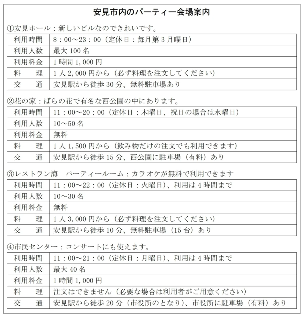 精品真题-N3阅读问题07随机试卷wapai6个月前发布关注私信21042 0% 0 投票, 0 平均值 0 N3 精品真题-N3阅读问题07随机试卷 从历年真题中随机抽取当前题目类型中的若干道问题进行显示,方便您对一类问题进行多次训练,快速提高 阅读问题07 下のページは、映画館のホームページである。これを読んで、下の質問に答えなさい。答えは、1・2・3・4から最もよいものを一つえらびなさい。 1 / 10 分类: N3阅读问题07 問題7 つぎのベージは、あるスキー場のホームページに載っているスキー教室の案内である。これを読んで、下の質問に答えなさい。答えは、1・2・3・4から最もよいものを一つ選びなさい。 阅读问题07-39 コウさんは、今年の6月から「イワシタホール」クラブカード会員になった。コウさんが受けられるサービスはどれか。 1) 来年の12月まで、「イワシタホール」で何度でも無料で映画を見られる。 2) 毎月、映画のスケジュールが書かれたパンフレットを郵送してもらえる。 3) 一緒に映画を見に行った人の料金が、毎回1名だけ1,000円にしてもらえる。 4) 誕生日の月に「イワシタホール」に行くと、特別なプレゼントがもらえる。 收藏 题目是:コウさん今年6月开始成为了影院持卡会员,他能够享受到的服务是什么? 本题考查的是会员享受到的服务可以在会员征集信息下面可以找到答案,服务内容里面第三条:和会员一起来的顾客可以享受票价为1000日元的折扣价的服务(每次只有一个人可以享受)。所以选项3是正确的。 阅读问题07 問題7 つぎのベージは、あるスキー場のホームページに載っているスキー教室の案内である。これを読んで、下の質問に答えなさい。答えは、1・2・3・4から最もよいものを一つ選びなさい。 2 / 10 分类: N3阅读问题07 問題7 つぎのベージは、あるスキー場のホームページに載っているスキー教室の案内である。これを読んで、下の質問に答えなさい。答えは、1・2・3・4から最もよいものを一つ選びなさい。 阅读问题07-38 グエンさんは、友達4人と特別コースを受けたいと思っている。グエンさんたちは、朝山ホテルに泊まっている。午後2時から4時まで特別コースを受ける場合、グエンさんたちはいくら支払わなければならないか。 1) 22,000円を支払う。 2) 22,000円から2,000円を引いたものを支払う。 3) 39,000円を支払う。 4) 39,000円から2,000円を引いたものを支払う。 收藏 问题是:グエン想和4个朋友一起上特殊课程。他们住在朝山酒店。下午2点到4点上特殊课程的情况,他们必须支付多少钱? 1支付22,000日元 2支付22,000日元减2,000日元的金额 3支付39,000日元 4支付39,000日元减2,000日元的金额 根据提问和选项可知,关键词是「友達4人と」「特别コース」「朝山ホテル」「午後2時から4時まで」,由此可定位表格中的关键句在「特別コース(2時間または4時間)」的部分。他们一共5个人,授课俩小时的情况需要支付22,000日百元,但下面提示到「グループの中に、朝山ホテルにお泊りの方がいれば、グループの料金から2,000円割引します」(如果团队中有人入住朝山酒店,团费优惠2,000日元)。因此他们需要支付的费用是22,000日元减去2,000日元的部分。因此选项2是正确答案。 阅读问题07 右のページは、自然教室の案内である。これを読んで、下の質問に答えなさい。答えは、1・2・3・4から最もよいものを一つえらびなさい。 3 / 10 分类: N3阅读问题07 問題7 つぎのベージは、あるスキー場のホームページに載っているスキー教室の案内である。これを読んで、下の質問に答えなさい。答えは、1・2・3・4から最もよいものを一つ選びなさい。 阅读问题07-38 ヤンさん夫婦は息子を連れて自然教室に参加しようと思っている。家族で相談した内容をメモにしたが、ヤンさん家族の希望に合っている自然教室はどれか。 1) ① 2) ② 3) ③ 4) ④ 收藏 正解:3 解析:问题是:やンさん夫妇想带着儿子参加“自然教室”。把一家人谈话内容做了笔记,符合ヤンさん夫妇期望的“自然教室”是哪一个? 我们去表格中找到(ヤンさんのメモ) 一栏,发现需要在8月14号至18号之间,想要创造在大自然中度过的时光,有留宿的项目比较好,成年人一人的费用想要保证在 1万日元以下。教室①的时间不符合;教室②只能观察大自然不能亲近享受大自然,排除;教室④费用不符合,所以正确答案为选项③。 阅读问题07 下の表は電車の時刻表(※)です。これを見て、次の質問に答えなさい。答えは、1・2・3・4から一つ選びなさい。 4 / 10 分类: N3阅读问题07 問題7 つぎのベージは、あるスキー場のホームページに載っているスキー教室の案内である。これを読んで、下の質問に答えなさい。答えは、1・2・3・4から最もよいものを一つ選びなさい。 阅读问题07-37 (※)この時刻表には、電車の出発時間や到着時間が書いてあります。到着と言うのは、着くと言う意味です。 7月15日に東京から新大阪へ行きます。東京駅に8:04に着きました。なるべく早く新大阪駅に着くためにはどの電車に乗らなければなりませんか。 1) 8:03のぞみ103です 2) 8:06ひかり403です 3) 8:13のぞみ009です 4) 8:20のぞみ211です 收藏 73.正解:3 解析:从表中可以看